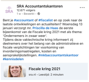 In de periode van 13 januari t/m 15 februari 2021 verzorgt mr. Priscilla de Haas voor diverse SRA-kringen een bijeenkomst onder het thema: “Ondernemers in zwaar weer”. Tijdens deze vaktechnisch kring informeert zij de deelnemende accountants en fiscalisten over het belang van administratieve en fiscale verplichtingen ter voorkoming van handhavingsmaatregelen, invorderingsmaatregelen en aansprakelijkstellingen en belicht zij ook enkele andere actualiteiten op het gebied van toezicht.